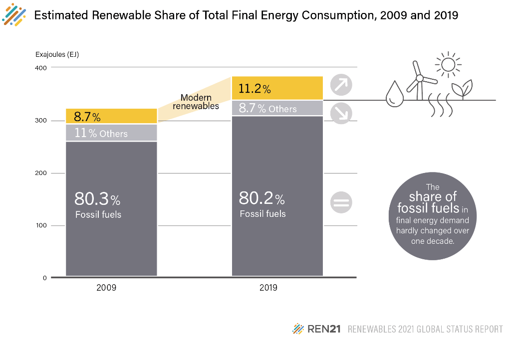 “We are waking up to the bitter reality that the climate policy promises over the past ten years have mostly been empty words. The share of fossil fuels in final energy consumption has not moved by an inch,” said Rana Adib, REN21’s executive director.