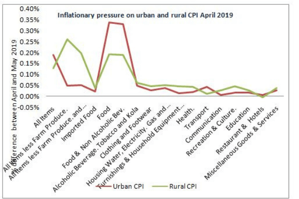 Imported food price inflation of the composite CPI majorly inspired the hike as it was up by 0.09 per cent to 15.68 per cent YoYin April 2019 from 15.59 per centcrecorded in March 2019. It became evidently that it was higher in urban centres—16.14 percent YoY in April 2019 (from 11.54 per cent in March) than in rural communities—15.30 per cent YoY in April 2019 (from 15.17 per cent in March).