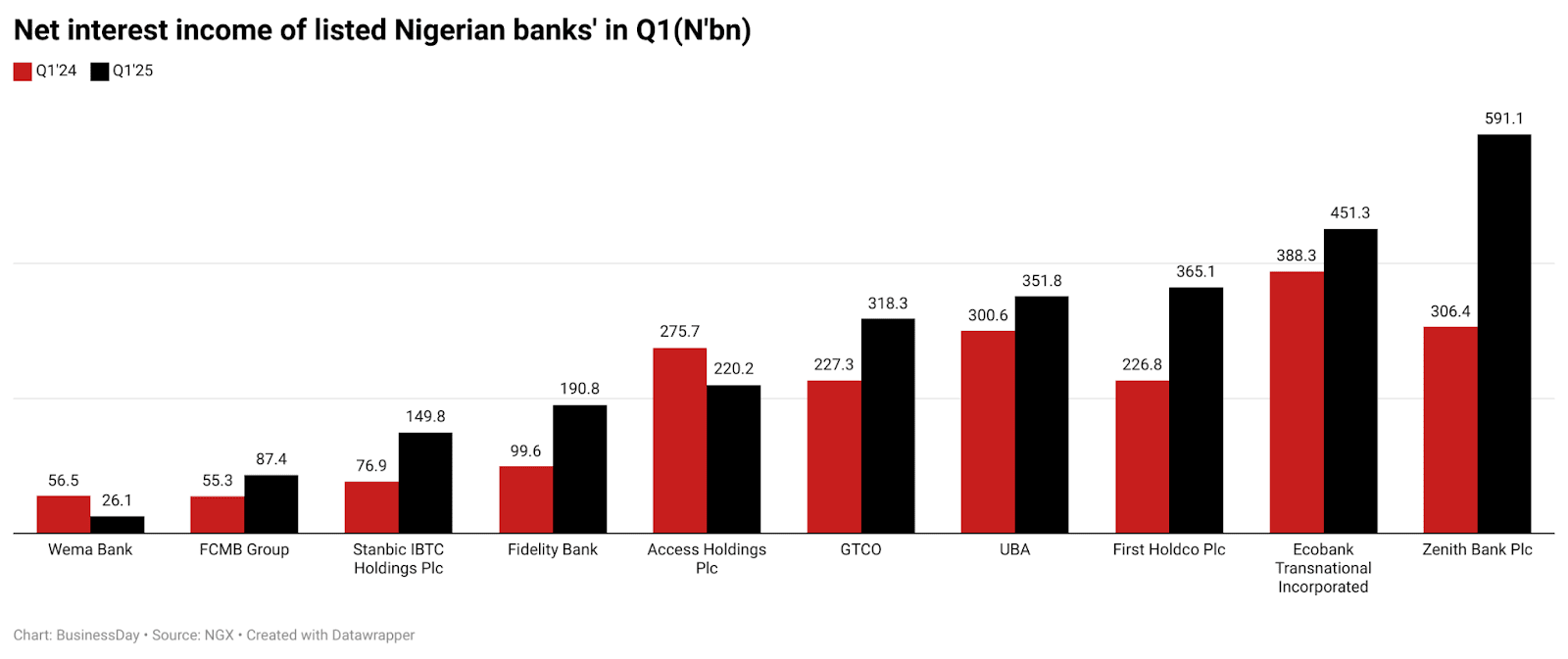 Zenith Bank led the pack with the highest net interest income at N591.1 billion, followed by ETI with N451.3 billion and First HoldCo with N365.1 billion.