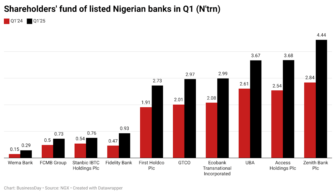 The shareholders’ fund of the ten listed Nigerian banks surveyed rose to N23.1 trillion in Q1 from N15.6 trillion in the same period of last year.