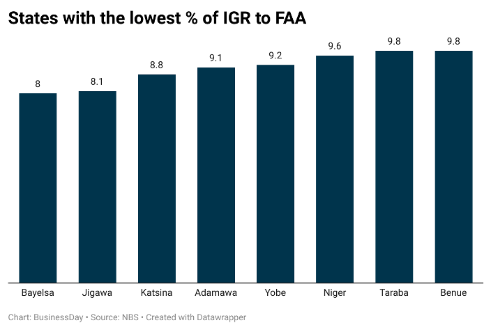 An Annual States Viability Index (ASVI) sourced from the National Bureau of Statistics (NBS) comparing the IGR of each state with its Federation Account Allocations (FAA) shows that eight states have a poor IGR of less than 10 percent.
