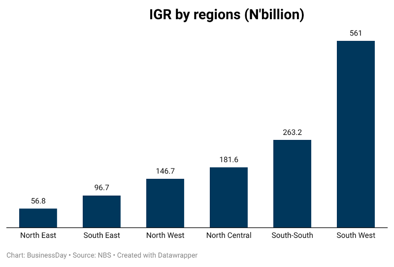 Followed closely by the oil-rich South-South region of N263.2 billion while North Central, North West, South East, and North East regions recorded IGR of N181.6 billion, N146.7 billion, N96.7 billion and N56.8 billion, respectively.
