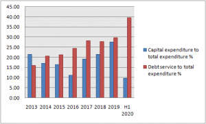 January to May 2020 statistics from the Budget Office of the Federation puts debt service to total expenditure in Nigeria at 39.6 percent while capital expenditure to total expenditure was at a low of 9.76 percent.