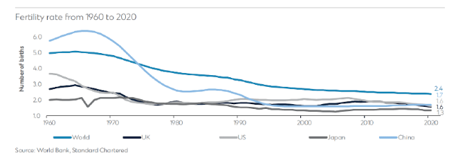 The final potential driver of higher inflation is the world’s aging demographics. Urbanisation, the prevalence of the internet and more access to education are driving fertility rates lower around the globe. This will reduce the size of the global workforce and likely give workers increased bargaining power, as opposed to the declining share of the spoils of capitalism for workers that has been the trend over the past 30 years. If this scenario plays out, higher wages will likely put upward pressure on inflation.