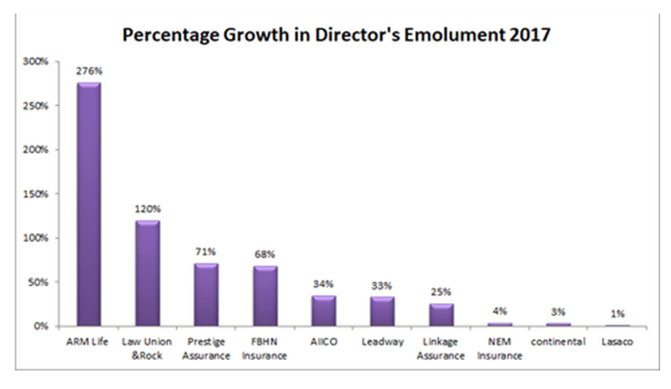 Companies such as ARM life, Law Union Rock, Prestige Assurance, FBHN insurance and AIICO led the chart as the firms with the highest growth in director’s emoluments for the period.