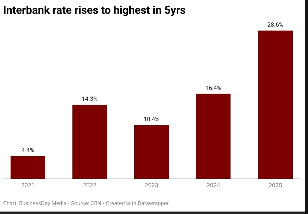 Data from the CBN shows a dramatic rise in interbank rates over the past five years, with rates going from as low as 4.40 percent in January 2021 to a peak of 28.58 percent in January 2025.