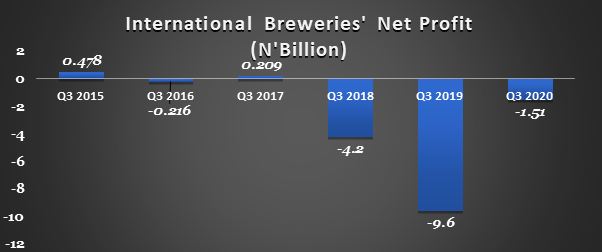 International Breweries also reported a net foreign exchange loss of N1.3 billion in the period from a gain of N501 million in Q3’19.