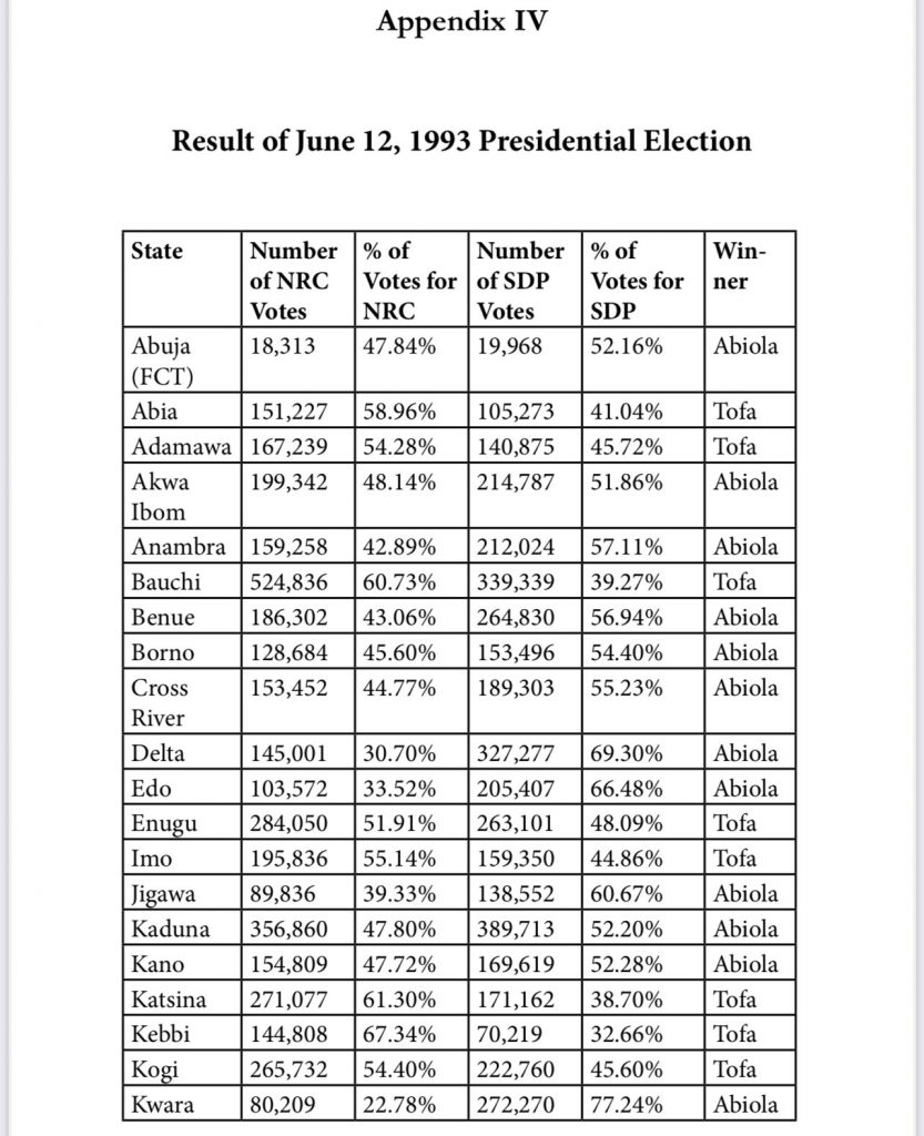 The former military dictator published the result of the election in each of the 30 states of the federation at the time in the appendix of the book.