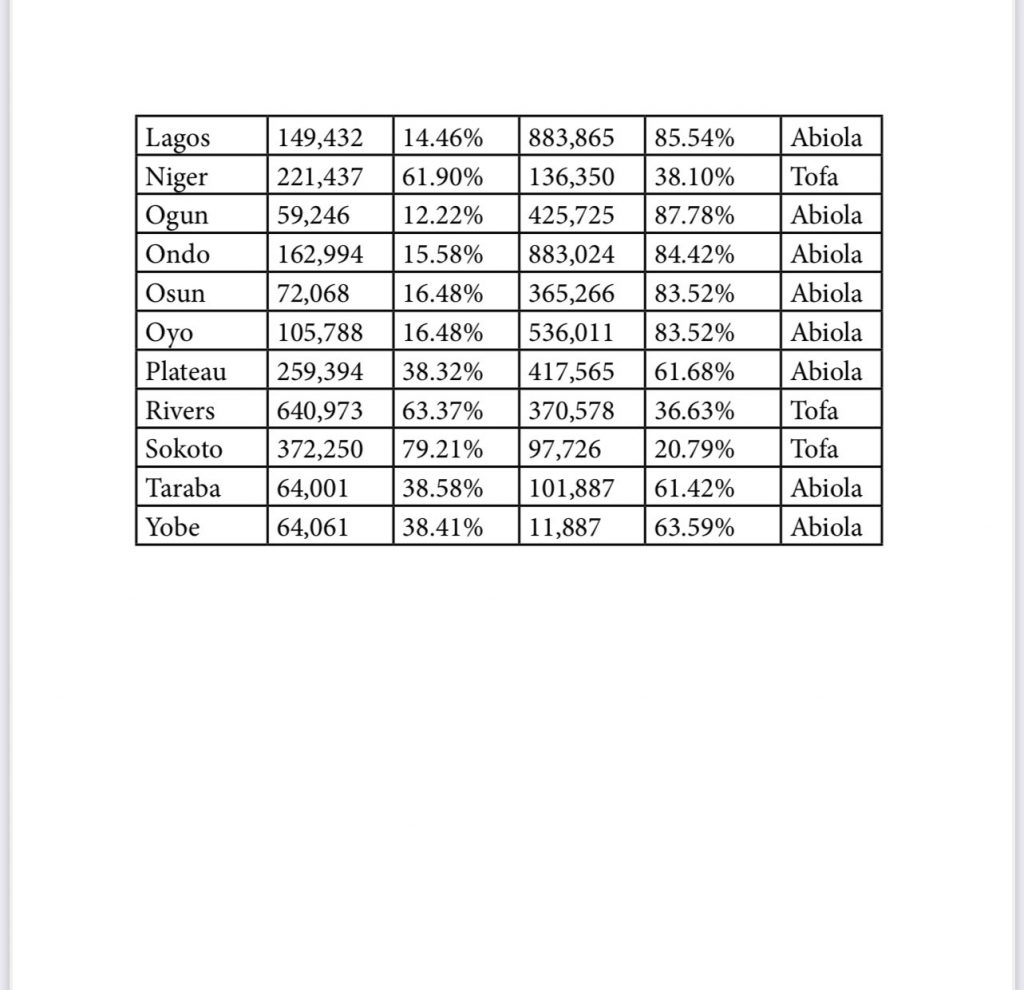 “Upon closer examination of the original collated figures from the 110,000 polling booths nationwide, it was clear that he satisfied the two main constitutional requirements for winning the Presidential elections, mainly majority votes and geographical spread, having obtained 8,128,720 votes against Tofa’s 5,848,247 votes and securing the mandatory one-third of the votes cast in 28 states of the federation, including Abuja.”