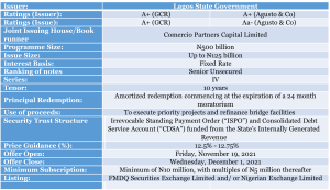 The Lagos State Government on Friday, November 19, 2021, offered for subscription N125billion ten-year Series IV Bonds under the State’s N500 billion Bond Issuance Programme.