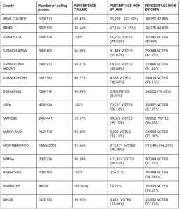 Weah leads in Bong, Grand Bassa, Rivercess, Sinoe, Grand Gedeh, Rivergee, Grand Kru, and Maryland Counties as of the electoral body’s Oct. 16 statistics, while Boakai has sway over Nimba, Lofa, Margibi, Montserrado, Bomi, Grand Cape Mount, and Gbarpolu Counties.