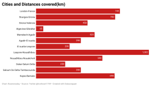 On the eleventh day, he travelled from Marrakech (the Kingdom of Morocco’s fourth-largest city) via Agadir to Elouatia, all in Morocco, to Leayone through Sahara, covering a total distance of 1,217km.