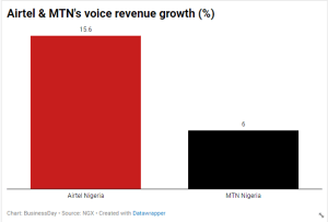 Aside from data, Airtel Nigeria’s revenue from voice grew by constant currency growth of 15.6 percent faster than the 6 percent voice revenue growth of MTN N.
