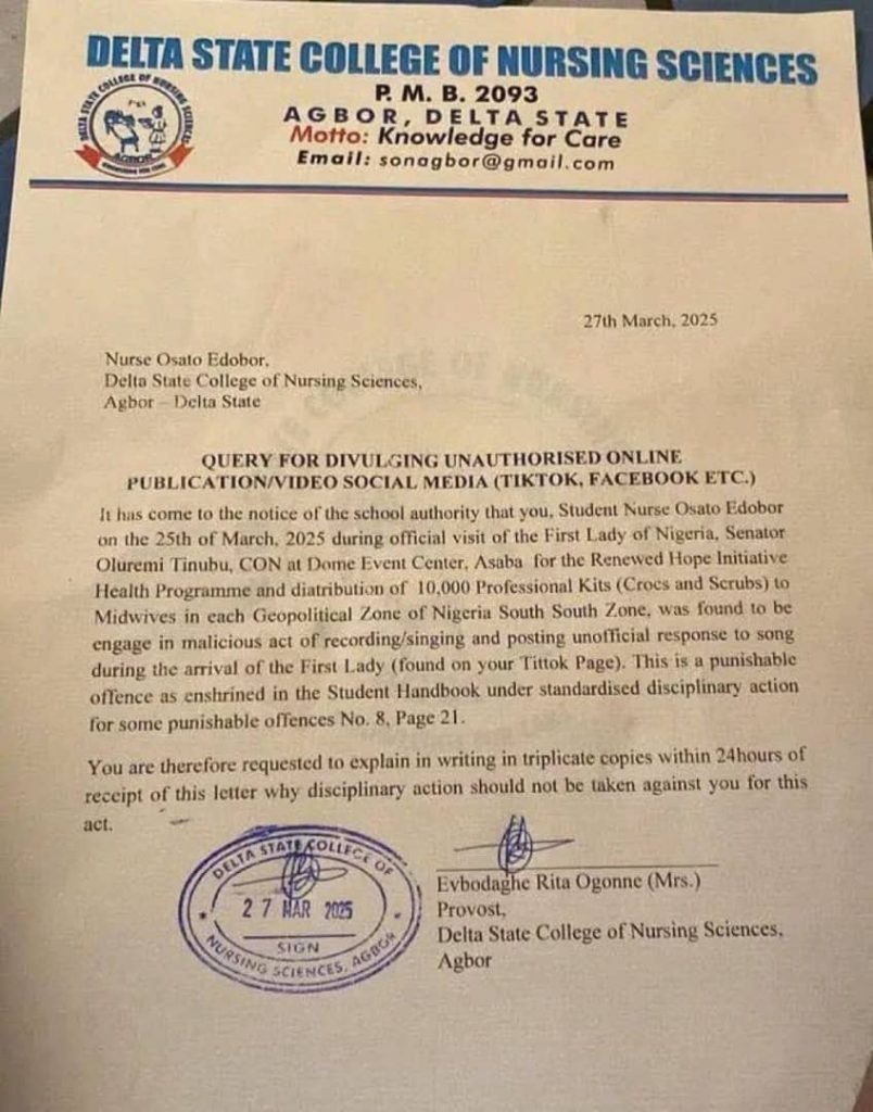 The Delta State College of Nursing Sciences has issued a disciplinary query to student nurse, Osato Edobor, for allegedly recording and sharing an “unauthorised” video on social media during First Lady Oluremi Tinubu’s visit to Delta State.