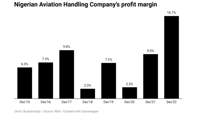 Nigerian Aviation Handling Company (NAHCO), an aviation ground handling service provider recorded a 16.7 percent profit margin which implies profitability despite accelerating inflation, BusinessDay analysis show.