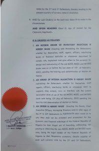 Honorable Justice Eneojo Eneche of the Federal High Court in Abuja on Monday issued an order prohibiting President Muhammadu Buhari, the Central Bank of Nigeria (CBN), CBN Governor Godwin Emefiele, and 27 commercial banks from suspending, interfering with, or extending the February 10 deadline or issuing any other directive concerning that date.
