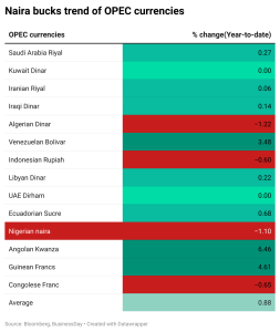 Only the Algerian Dinar, down 1.22 percent, has lost more value than the Nigerian naira among the currencies of countries in the Organisation of Petroleum Exporting Countries (OPEC) this year.