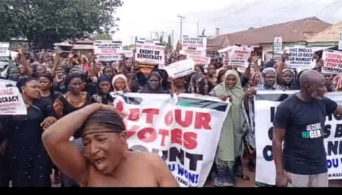 The women who turned out in large number were seen matching from the state Secretariat of the People’s Democratic Party (PDP) to the INEC office, with placards and leafs, while some other are naked rolling on the ground and floating their breast to express their dissatisfaction and cause on INEC.