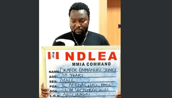 Operatives of the National Drug Law Enforcement Agency (NDLEA) have arrested an ex-footballer, Okafor Emmanuel, at the Murtala Muhammed International Airport, Ikeja, Lagos.