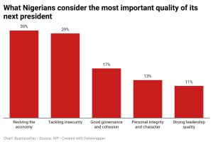 Twenty-nine percent identified commitment to tackle insecurity, and for 17 percent of respondents, commitment to promoting good governance and cohesion was identified as the top quality they want to see in the next leader of the country.