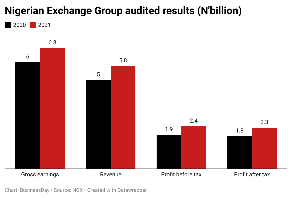 Nigerian Exchange Group audited results for the full year ended December 31, 2021 showed the Group’s gross earnings grew to N6.8 billion from N6 billion, resulting in a 13 percent increase. Revenue rose by 14.9 percent from N5 billion recorded in 2020 to N5.8 billion in 2021. Also, the group’s profit before tax (PBT) increased by 25.4 percent to N2.4 billion from N1.909billion in 2020, while its profit after tax (PAT) rose by 22.2 percent to N2.3 billion from N1.84 billion recorded in the corresponding period of 2020.