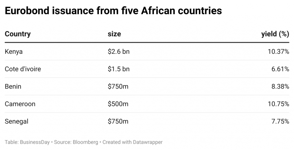 Côte d’Ivoire became the first African nation to re-enter the market post Covid-19, issuing $2.6bn Eurobonds in January 2024 at a yield of 6.61 percent, similarly Kenya successfully issued a new $1.5 billion Eurobond (10.37%) in February 2024.