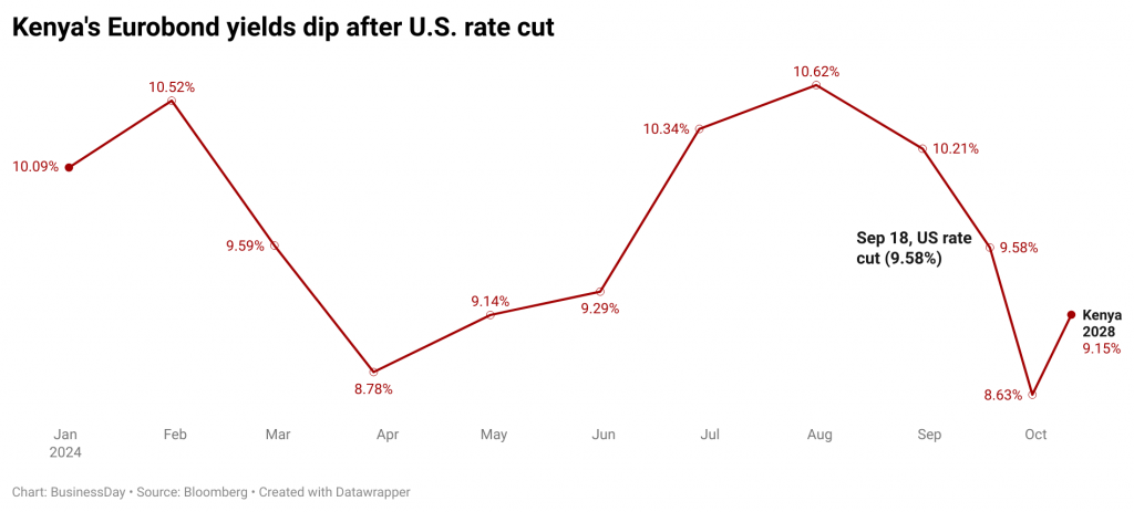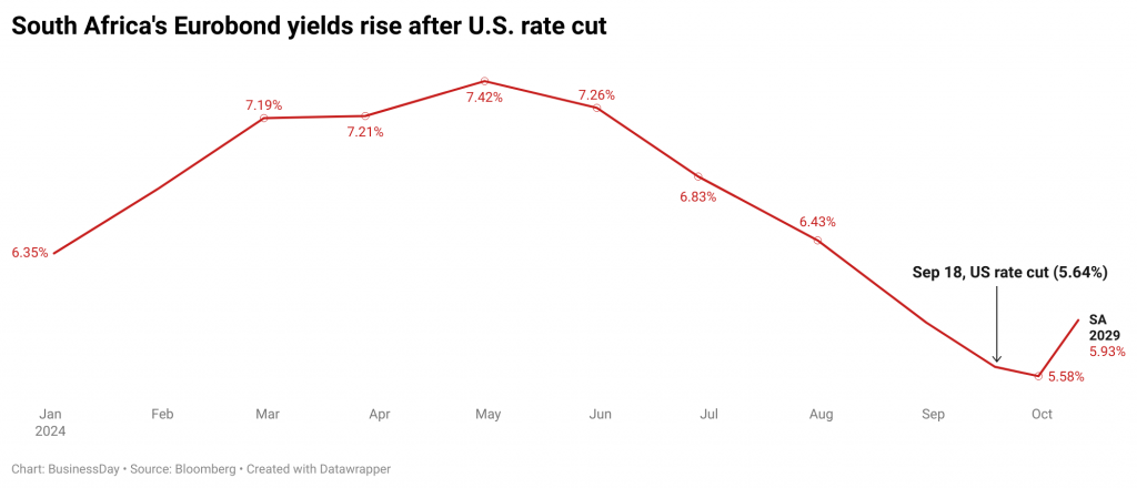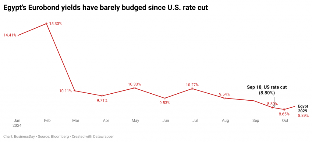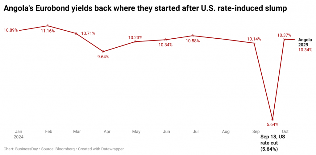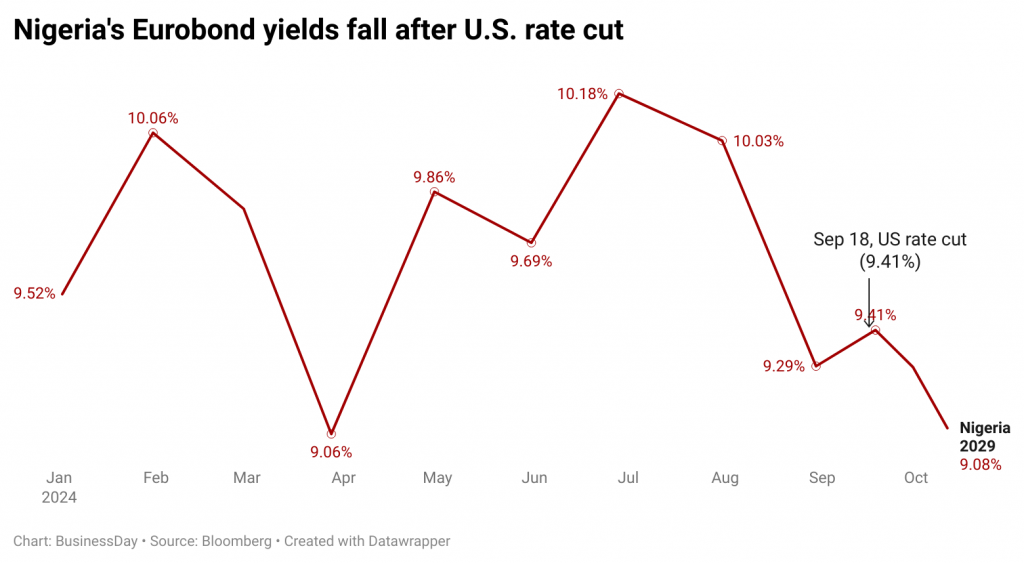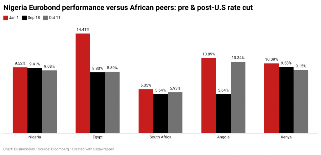Since the interest rate cut by the United States Federal Reserve on September 18, yields on Nigerian Eurobonds have dipped 343 basis points, compared to a rise in the yields of Egyptian (+101 percent), South African (+517 percent) and Angolan bonds (+83.38 percent).