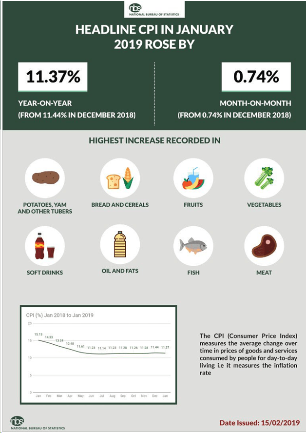 According to NBS report released Friday morning, Urban inflation rate increased by 11.66 per cent (year-on-year) in January 2019 from 11.73 per cent recorded in December 2018, while the rural inflation rate increased by 11.11 per cent in January 2019 from 11.18 per cent in December 2018.