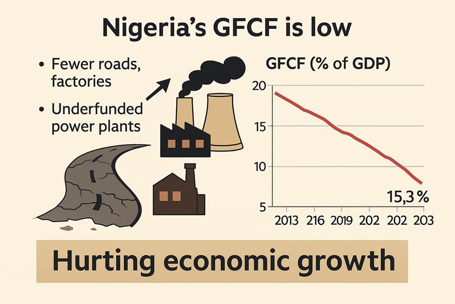 According to World Bank data, Nigeria’s Gross Fixed Capital Formation (GFCF) as a share of gross domestic product (GDP) has hovered below 20 percent for much of the past decade. In 2023, it slipped to around 15.3 percent, compared to over 30 percent in some emerging market peers like Vietnam and Indonesia.