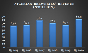 NB’s revenue is up 25.5 percent to N82.2 billion, the highest in six years, in Q3’20 compared to N65.4 billion a year ago, outperforming Guinness Nigeria which saw revenue rise 11.9 percent in the same period.