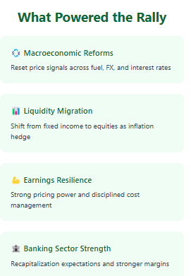 Several forces came together to reshape market outcomes in 2025. Macroeconomic reforms reset long-distorted price signals across fuel, foreign exchange, and interest rates, forcing investors to reprice risk more honestly. As fixed-income yields struggled to keep pace with inflation, liquidity migrated steadily into equities, driven by pension funds, asset managers, and increasingly confident retail investors. Corporate earnings proved more robust than expected, supported by pricing power, foreign exchange repricing, and disciplined cost management. This earnings resilience provided the fundamental justification for higher valuations.