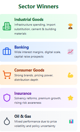 Sectoral performance in 2025 revealed where investors saw both protection and opportunity. Industrial goods led the market with outsized gains, buoyed by infrastructure spending, import substitution policies, and strong demand from construction and energy-related value chains. Cement, glass, and building materials benefited from improved foreign exchange availability and local sourcing advantages. Banking stocks followed closely, supported by wide interest margins, digital scale, and the prospect of capital raises that could unlock future credit growth.