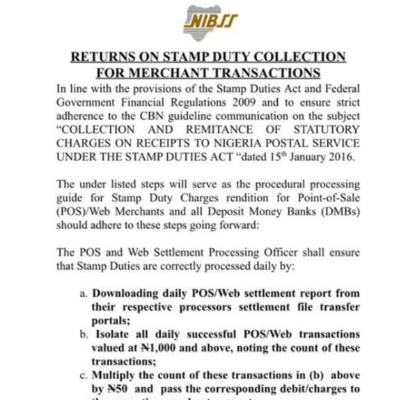 Following the announcement, the CBN in collaboration with Nigeria Interbank Settlement System (NIBSS) also directed that banks should charge N50 Stamp Duty on individual transactions that occur on Point of Sales (PoS), rather than the previous practice of charging on aggregate transactions.