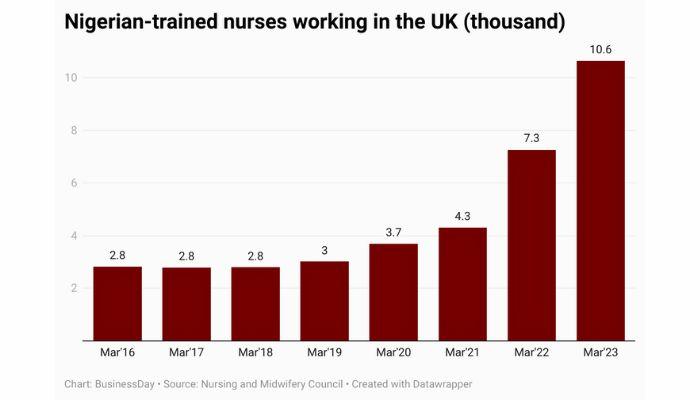 According to the latest mid-year register of the Nursing and Midwifery Council, the number of nurses, midwives and nursing associates from Nigeria rose by 46.6 percent (10,639) in the 12 months to March 2023 from 7,256 in the same period of 2022.