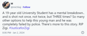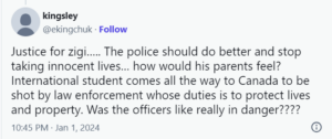 “You killed a 19 year old university student in his own apartment by shooting at him three times on New Year’s Eve, a second after yelling your instruction to him. What happened to using a taser, or shooting a non-vital part of his body? What is your training for? @wpgpolice,” said Omosaaa on X.