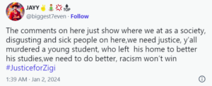 The victim’s acquaintances and other Nigerians on X had started trending #JusiticeforZigi aiming to draw more attention to the incident, and requesting proper legal proceedings.