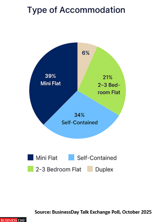 The BusinessDay Talk Exchange poll also shows mini-flats and self-contained units as the most commonly rented spaces, with 39 percent choosing the former, and 34 percent going for the latter.
