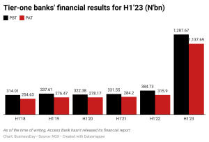 Data obtained from the Nigerian Exchange Limited showed FBN Holdings, Guaranty Trust Holding Company (GTCO), United Bank for Africa (UBA) and Zenith Bank posted a combined profit after tax of N1.13 trillion in H1 2023, compared to N315.9 billion in the same period of 2022.