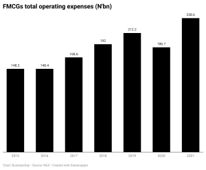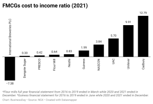 For the year ended December 2021, BusinessDay analysis ranks ten quoted FMCGs (Dangote Sugar, Presco, Flour Mill, Nestle, Guinness, NASCON, UAC, UNILEVER, Cadbury and International Breweries) by their cost to income ratio.