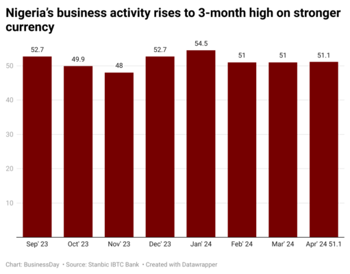 In April, the Purchasing Managers’ Index (PMI) by Stanbic IBTC Bank improved to 51.1 last month from 51.0 in March. Readings above 50.0 signal an improvement in business conditions, while those below show deterioration.