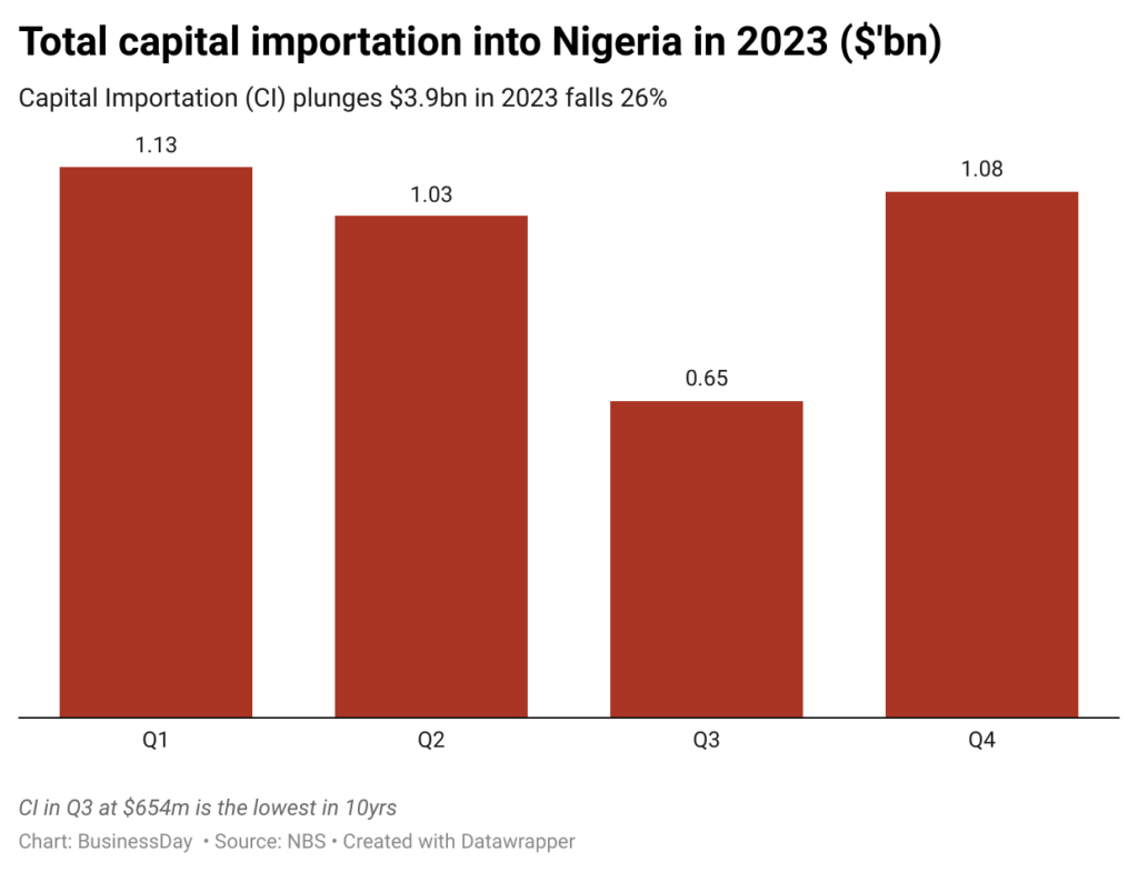 In the last quarter of 2023, total capital importation into Nigeria stood at $1.08 billion.