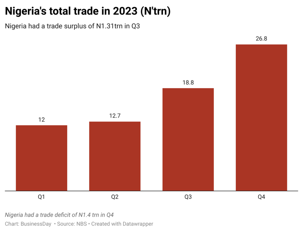 However, by Q4 2023, the trajectory changed with Nigeria’s trade recording a deficit as the value of imports outweighs exports.