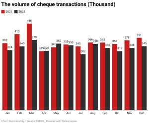 The value of transactions in cheques in the twelve months period fell by 0.27 percent to N5.2 billion in 2022 from N5.3 billion in the same period in 2021.