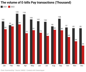 The E-bills pay channels, widely used for bills payment declined by 25 percent to 885.947 in 2022 from 1.1 million realised in the period under review.