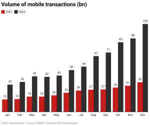 The value of transactions made through mobile in the twelve months of 2022 rose to N19.4 trillion, a 141 percent increase compared to N8 trillion in the same period of 2021,