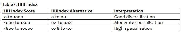 The HH index is an index for measuring a country’s absolute specialisation. It is used to determine whether a small number of sectors exhibit high portions of the overall income of the country. The index scores range from zero (good diversification) to ten thousand (high specialisation). Otherwise, it can be expressed between zero and one. The lower the value, the more diversified the economy.