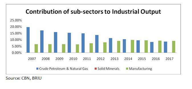 Lastly, taking a look at the contribution to industrial output from 2007 to 2017 to get a better perspective on the development of the industrial sector in Nigeria, the analysis indicates that unsurprisingly, solid minerals contributes barely one percent to industrial output.