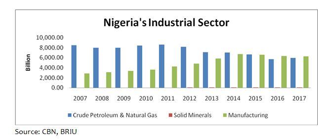 The industrial sector in Nigeria is made up of three major sub-sectors namely: crude petroleum & natural gas; manufacturing, and solid minerals. The performance analysis of these sub-sectors from 2007 to 2017 shows that crude petroleum & natural gas’ output has averaged N7.44 trillion and manufacturing output averaged N4.86 trillion. During the same period, solid minerals’ output averaged just N69.37 billion.