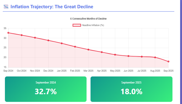 If the IMF upgrade was a vote of confidence, September’s inflation data was a standing ovation. Headline inflation fell to 18.02 percent, down from 20.12 percent in August—a 2.1 percentage point drop in a single month. This marks the sixth consecutive month of decline and represents a stunning 14.68 percentage point reduction from the 32.7 percent recorded in September 2024. Food inflation, the scourge of Nigerian households, plummeted to 16.87 percent from 21.87 percent in August, driven by sharp declines in the prices of maize, garri, beans, millet, potatoes, and other staples. More remarkable still: Nigeria recorded its first month-on-month food deflation in over 13 years, with food prices declining by 1.57 percent in September. This is not merely a statistical quirk. It reflects the onset of the harvest season, improved farm-to-market logistics, and, crucially, the easing of insecurity in key agricultural zones. For a country where households spend up to 70 percent of their income on food, this is nothing short of a lifeline. But context is everything. The National Bureau of Statistics’ rebasing of the Consumer Price Index—which shifted the base year from 2009 to 2019—accounts for part of the technical decline. The IMF, ever the realist, projects average consumer prices will decline from 31.4 per cent in 2024 to 23 percent in 2025 and 22 percent in 2026. End-of-period inflation is forecast at 21 percent in 2025 and 18 percent in 2026. Translation: while the trajectory is positive, the absolute level of prices remains punishingly high.