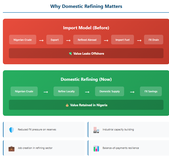 The implications extend beyond fuel prices at the pump. Petrol is a foundational input in transport, logistics, manufacturing, and services. Lower and more responsive prices alleviate cost pressures across the economy, temper inflation, and increase household purchasing power. The transmission effect, particularly in a highly oil-dependent economy like Nigeria’s, can influence production costs, food distribution, and wage negotiations. Furthermore, domestic refining strengthens macroeconomic resilience. Local refineries retain value within the economy, reduce foreign exchange dependence, and cushion the balance of payments from crude price shocks. With Dangote Refinery sourcing local crude and producing refined products domestically, Nigeria captures a previously lost portion of the value chain. In addition, the competitive pressure it exerts compels innovation, better logistics, and efficiency across the downstream ecosystem. While these benefits are early and uneven, they signal that deregulation is not merely a policy abstraction; it is a mechanism for structural transformation with measurable economic effects.